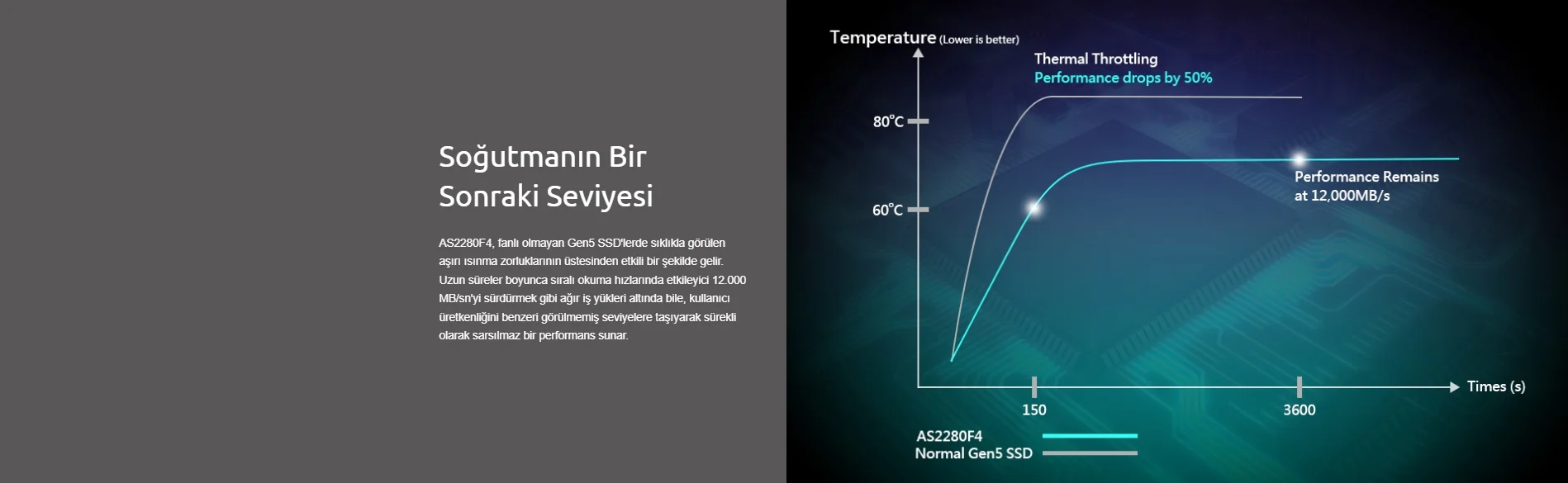 AS2280F4, fanlı olmayan Gen5 SSD'lerde sıklıkla görülen aşırı ısınma zorluklarının üstesinden etkili bir şekilde gelir. Uzun süreler boyunca sıralı okuma hızlarında etkileyici 12.000 MB/sn'yi sürdürmek gibi ağır iş yükleri altında bile, kullanıcı üretkenliğini benzeri görülmemiş seviyelere taşıyarak sürekli olarak sarsılmaz bir performans sunar.