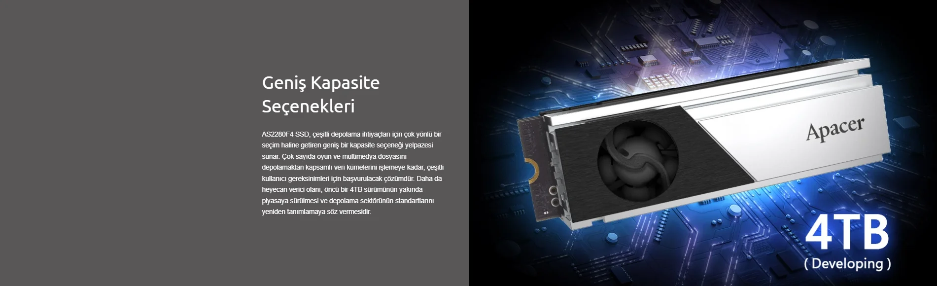 AS2280F4 SSD, çeşitli depolama ihtiyaçları için çok yönlü bir seçim haline getiren geniş bir kapasite seçeneği yelpazesi sunar. Çok sayıda oyun ve multimedya dosyasını depolamaktan kapsamlı veri kümelerini işlemeye kadar, çeşitli kullanıcı gereksinimleri için başvurulacak çözümdür. Daha da heyecan verici olanı, öncü bir 4TB sürümünün yakında piyasaya sürülmesi ve depolama sektörünün standartlarını yeniden tanımlamaya söz vermesidir.