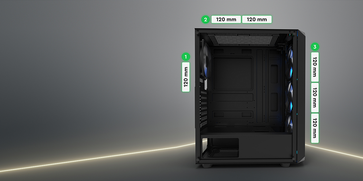 Geniş radyatör desteği ile yüksek performanslı oyunlar sırasında bile bilgisayarınızın serin kalmasına olanak sağlar..