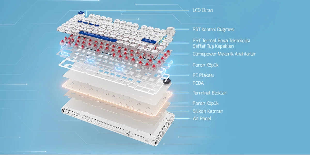 GamePower’da gasket yapısını keşfedin. Gasket tasarımı, tuşlardaki titreşimleri ve yay seslerini azaltan ses yalıtım köpüğü ile gelir. Yumuşak, esnek ve sessiz bir hisle tanışın.