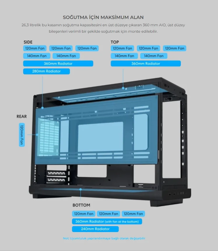 Fan Desteği Üst: 3 x 120mm Yan: 3 x 120mm veya 2 x 140mm Alt: 3 x 120mm Arka: 1 x 120mm