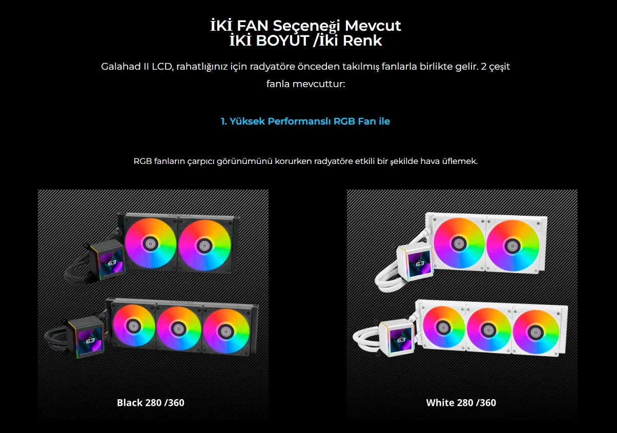 Galahad II LCD, rahatlığınız için radyatöre önceden takılmış fanlarla birlikte gelir. 2 çeşit fan mevcuttur.