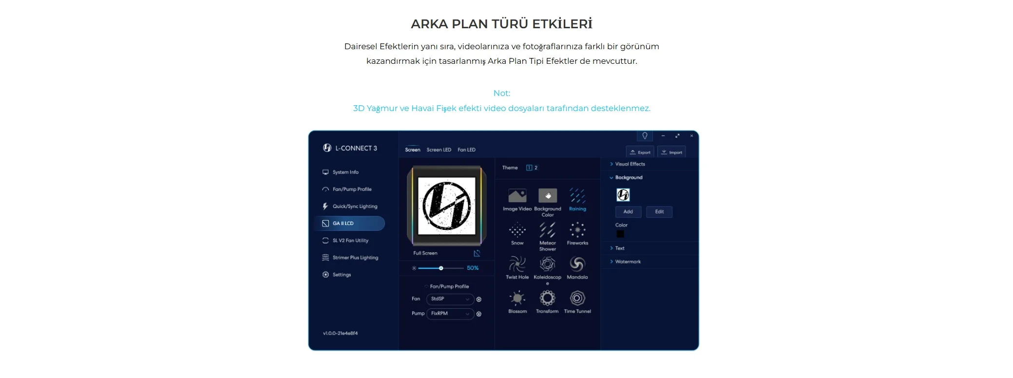 L-Connect 3, ekrandan ekran LED'ine ve fan aydınlatma efektlerine, pompa ve fanların hızına kadar Galahad II LCD üzerinde size tam kontrol sağlıyor.
