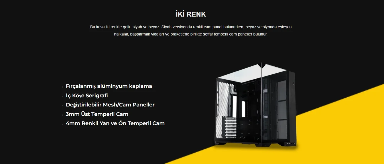 Bu kasa iki renkte gelir: siyah ve beyaz. Siyah versiyonda renkli cam panel bulunurken, beyaz versiyonda eşleşen halkalar, başparmak vidaları ve braketlerle birlikte şeffaf temperli cam paneller bulunur.- Fırçalanmış alüminyum kaplama