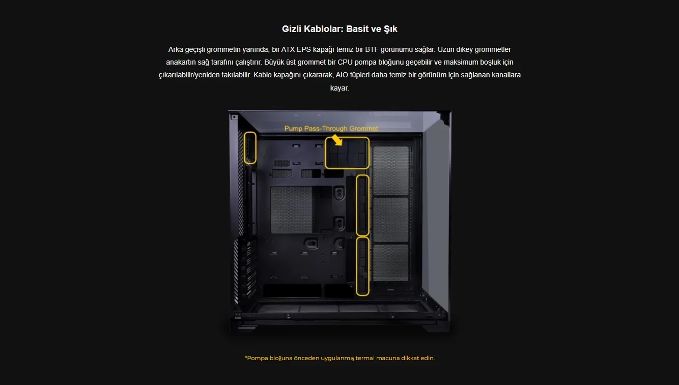 Arka geçişli grommetin yanında, bir ATX EPS kapağı temiz bir BTF görünümü sağlar. Uzun dikey grommetler anakartın sağ tarafını çalıştırır. Büyük üst grommet bir CPU pompa bloğunu geçebilir ve maksimum boşluk için çıkarılabilir/yeniden takılabilir. Kablo kapağını çıkararak, AIO tüpleri daha temiz bir görünüm için sağlanan kanallara kayar.