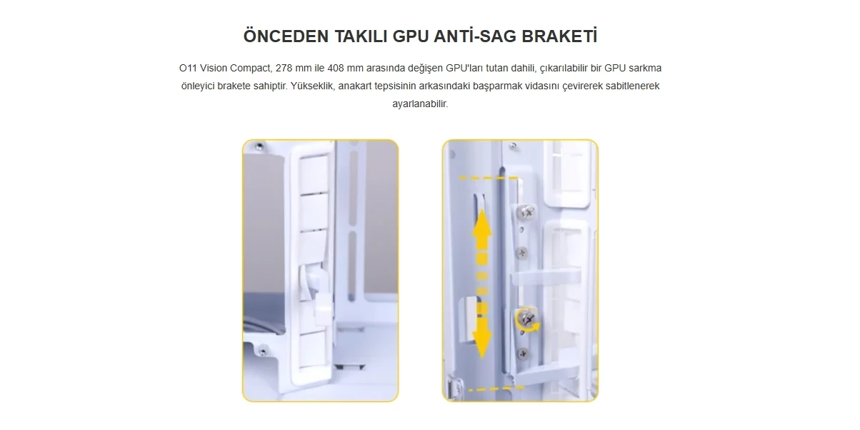 O11 Vision Compact, 278 mm ile 408 mm arasında değişen GPU'ları tutan dahili, çıkarılabilir bir GPU sarkma önleyici brakete sahiptir. Yükseklik, anakart tepsisinin arkasındaki başparmak vidasını çevirerek sabitlenerek ayarlanabilir.