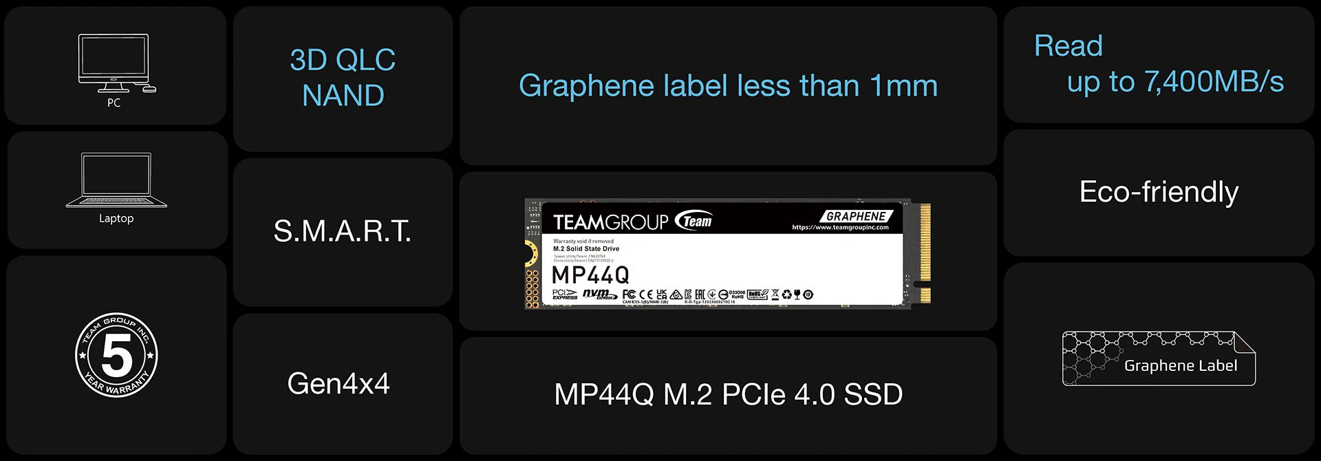 Team Group Inc.'in özel patentli 1 mm'den daha az kalınlığa sahip grafen ısı dağılımı etiketini bünyesinde barındıran SSD, montaj mekanizmalarıyla olası her türlü müdahaleyi etkili bir şekilde ortadan kaldırır. Anakartın doğal ısı emicisiyle birlikte, grafen dağılım etiketi SSD'nin yüksek hızda çalışmasıyla oluşan ısıyı etkili bir şekilde ele alır.